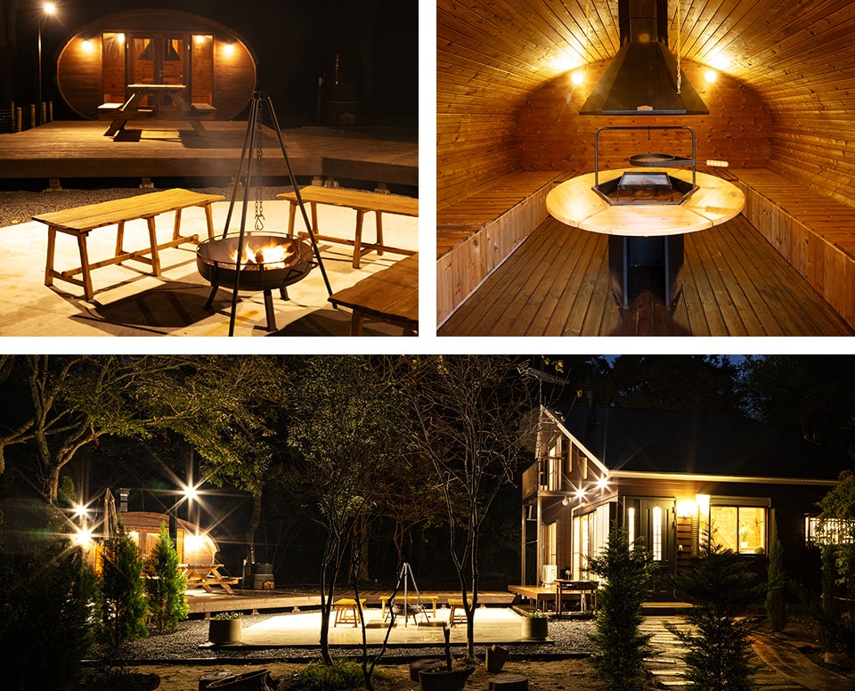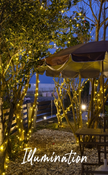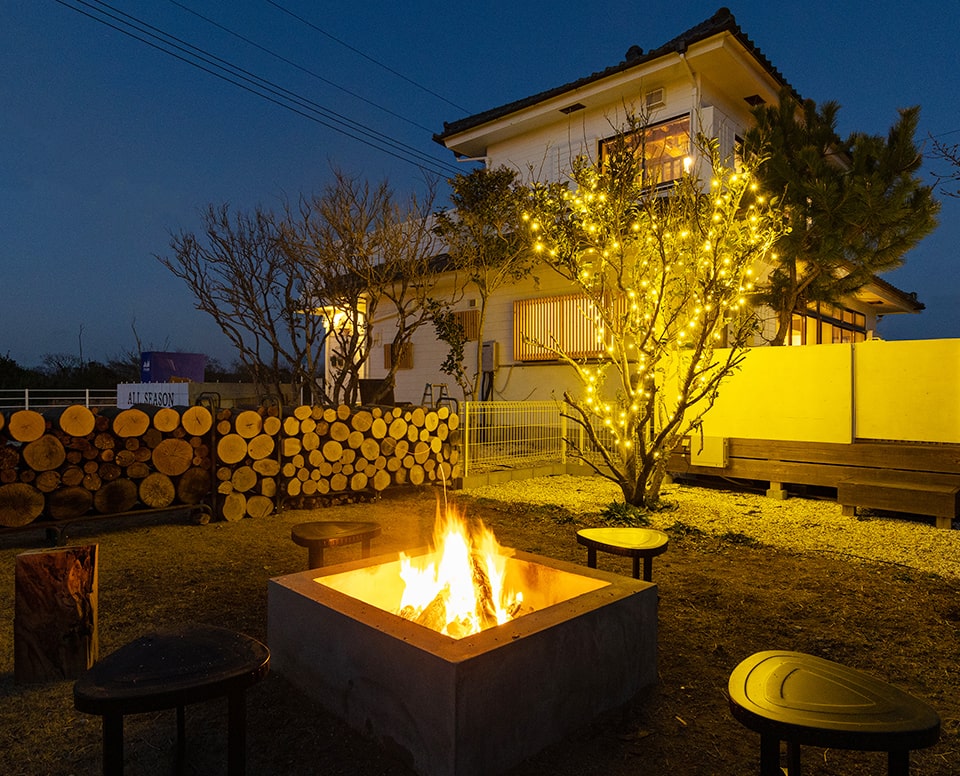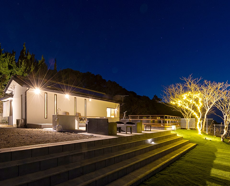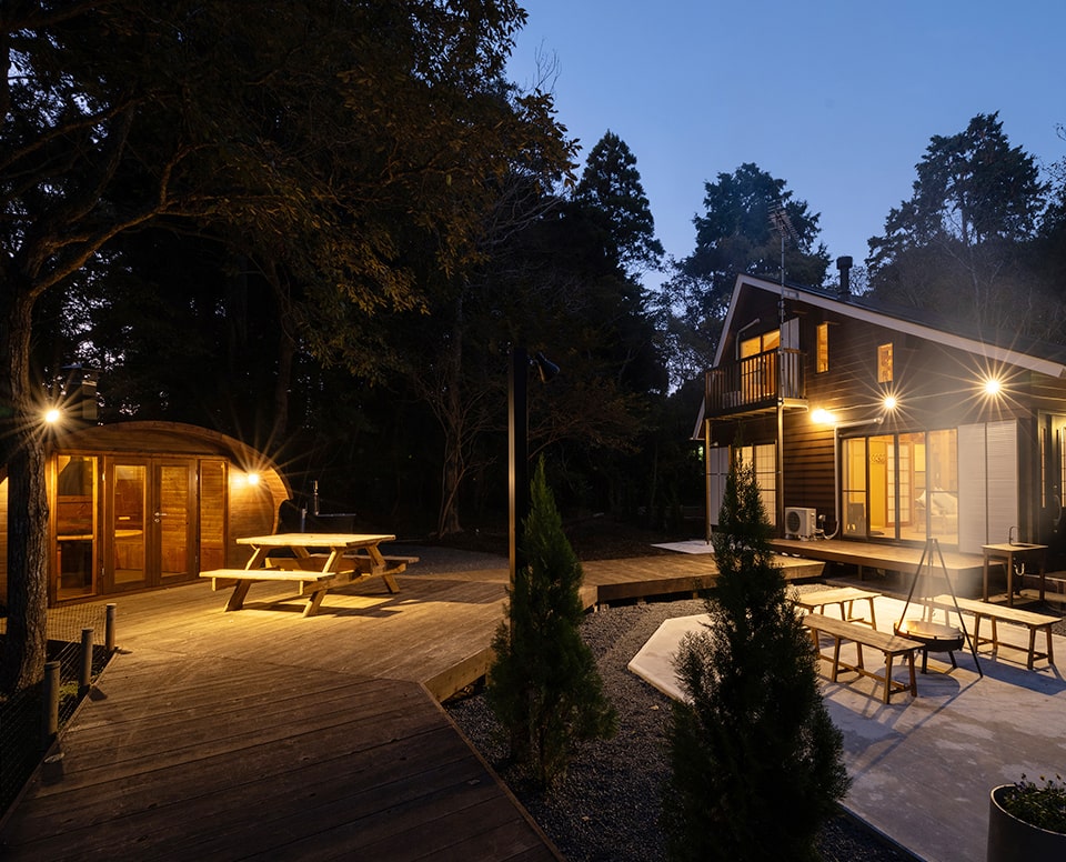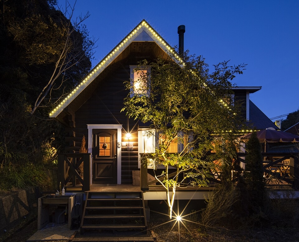 各棟には広々としたお庭やウッドデッキがあり、焚火やBBQが楽しめます。夜は満点の星空の下、イルミネーションを楽しみながらいつもとは違うときを過ごしてみてはいかがでしょうか。