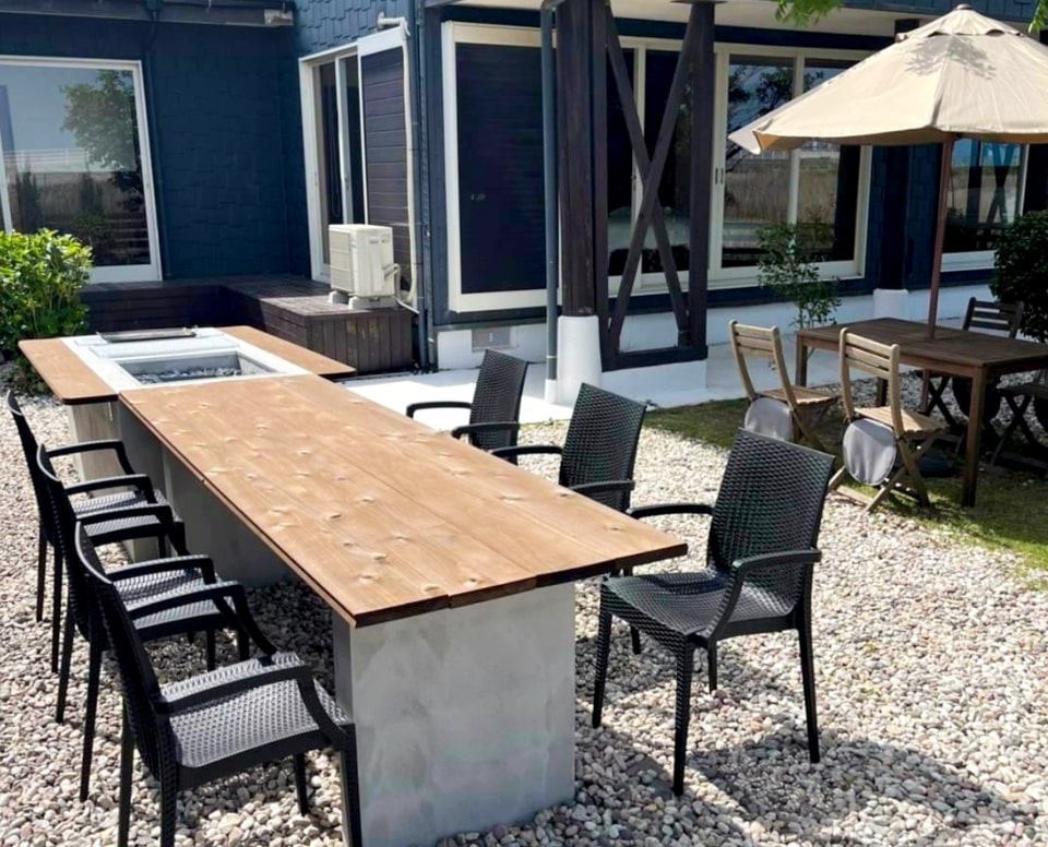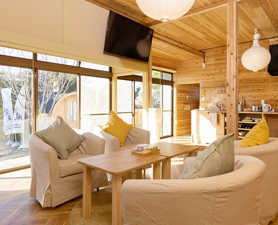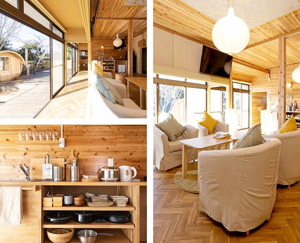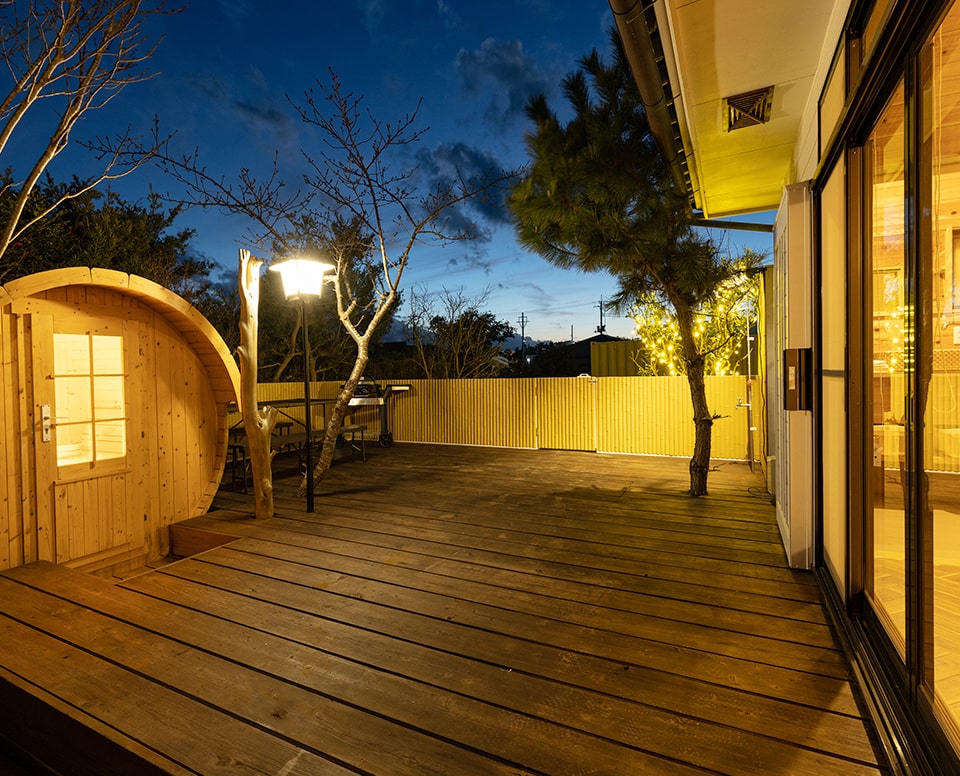 爽やかな光が入り込むリビングの大きな窓を開けるとオープンテラスに繋がります。テラスではBBQをしたり、本格的なバレルサウナで心と体を整えたり、夜は輝くイルミネーションと焚火をお楽しみいただけます。
