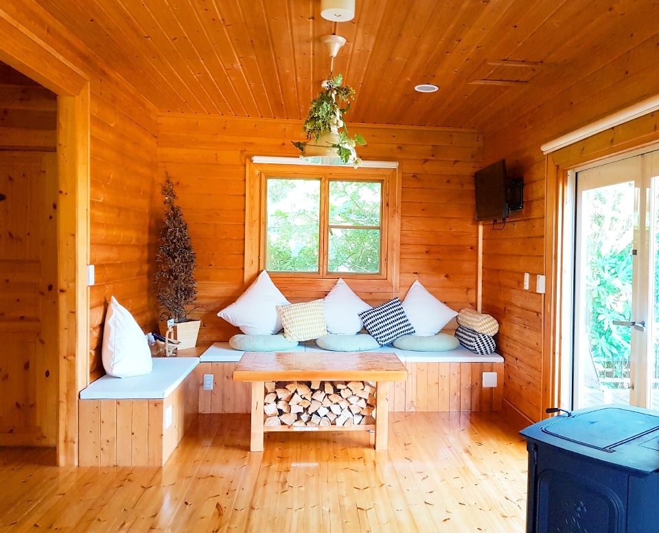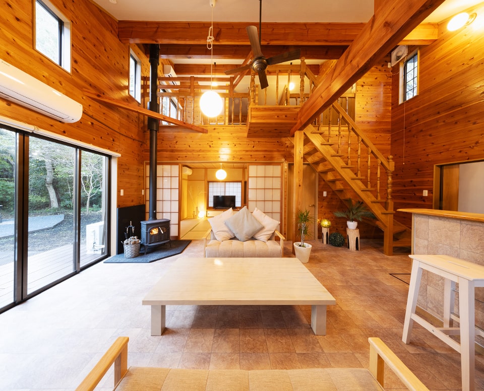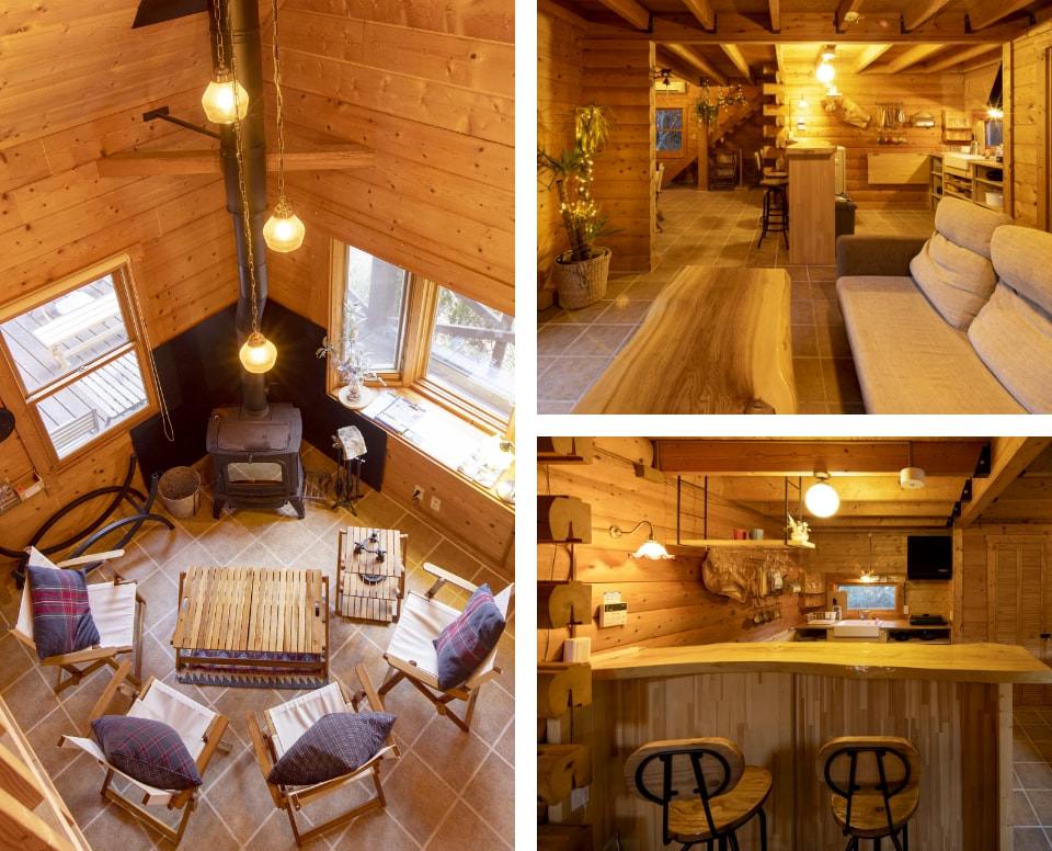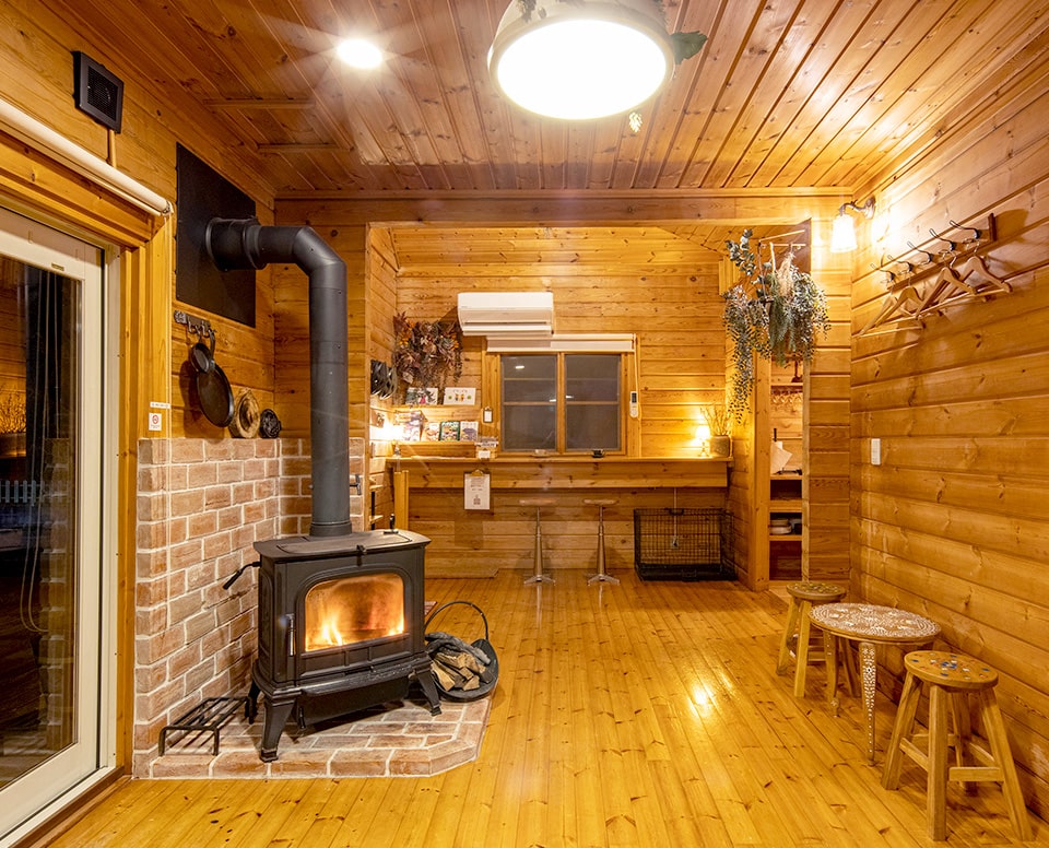 ログハウス調の内装と解放感溢れる吹き抜け天井が特徴的で、薪ストーブ前にはチェアやソファ、カウンター席をご用意しております。