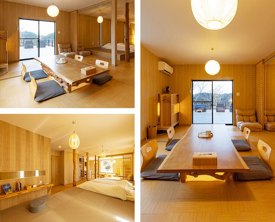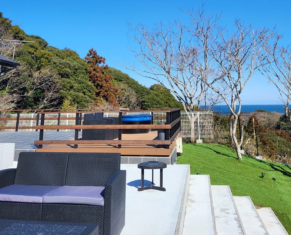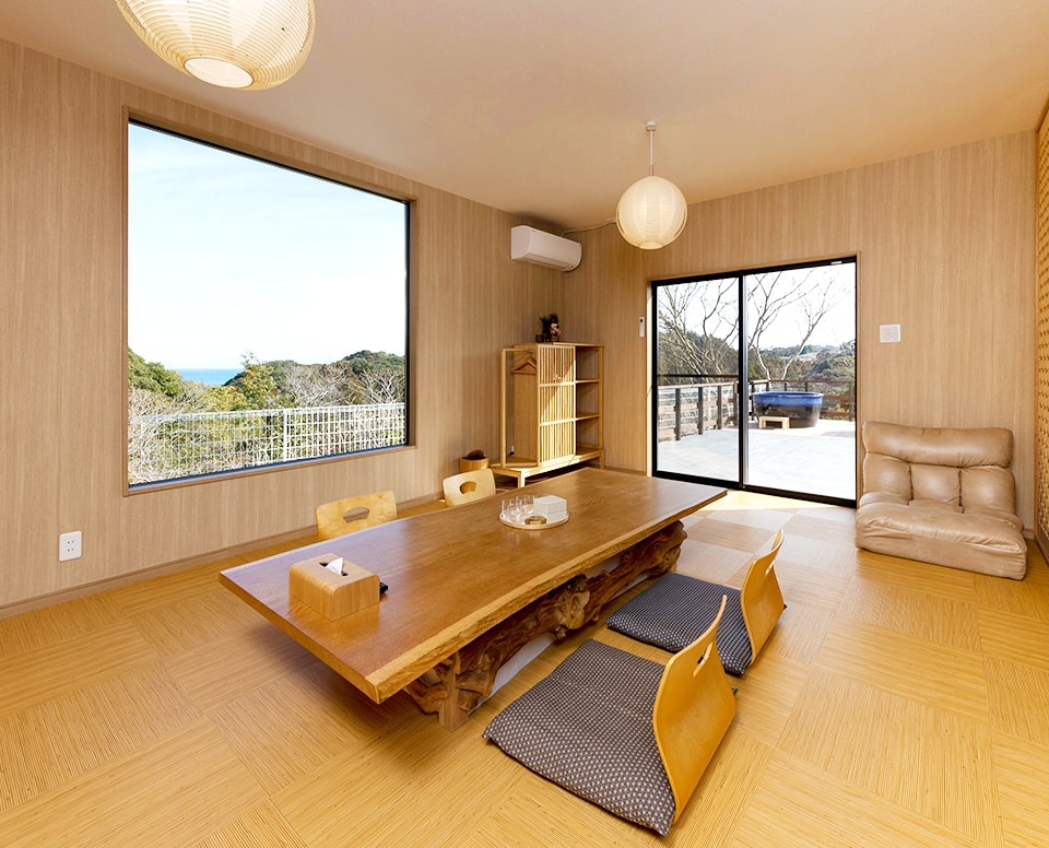 リビングと繋がる「絶景オーシャンビューテラス」では、広大な海や美しい夕日を眺めながらのんびりと天空露天風呂に浸かったり、BBQや露天囲炉裏で魚を焼いたり、夜は天体望遠鏡で頭上に広がる満点の星空を見ることもできます。